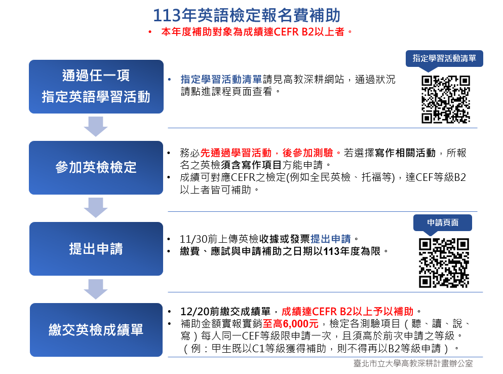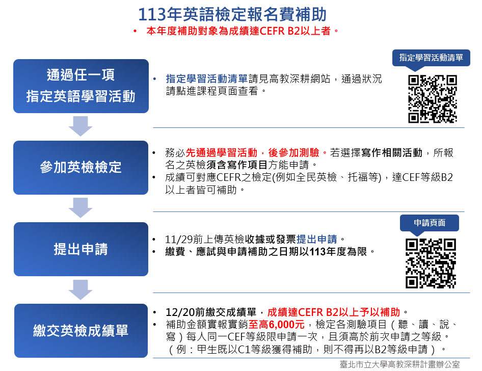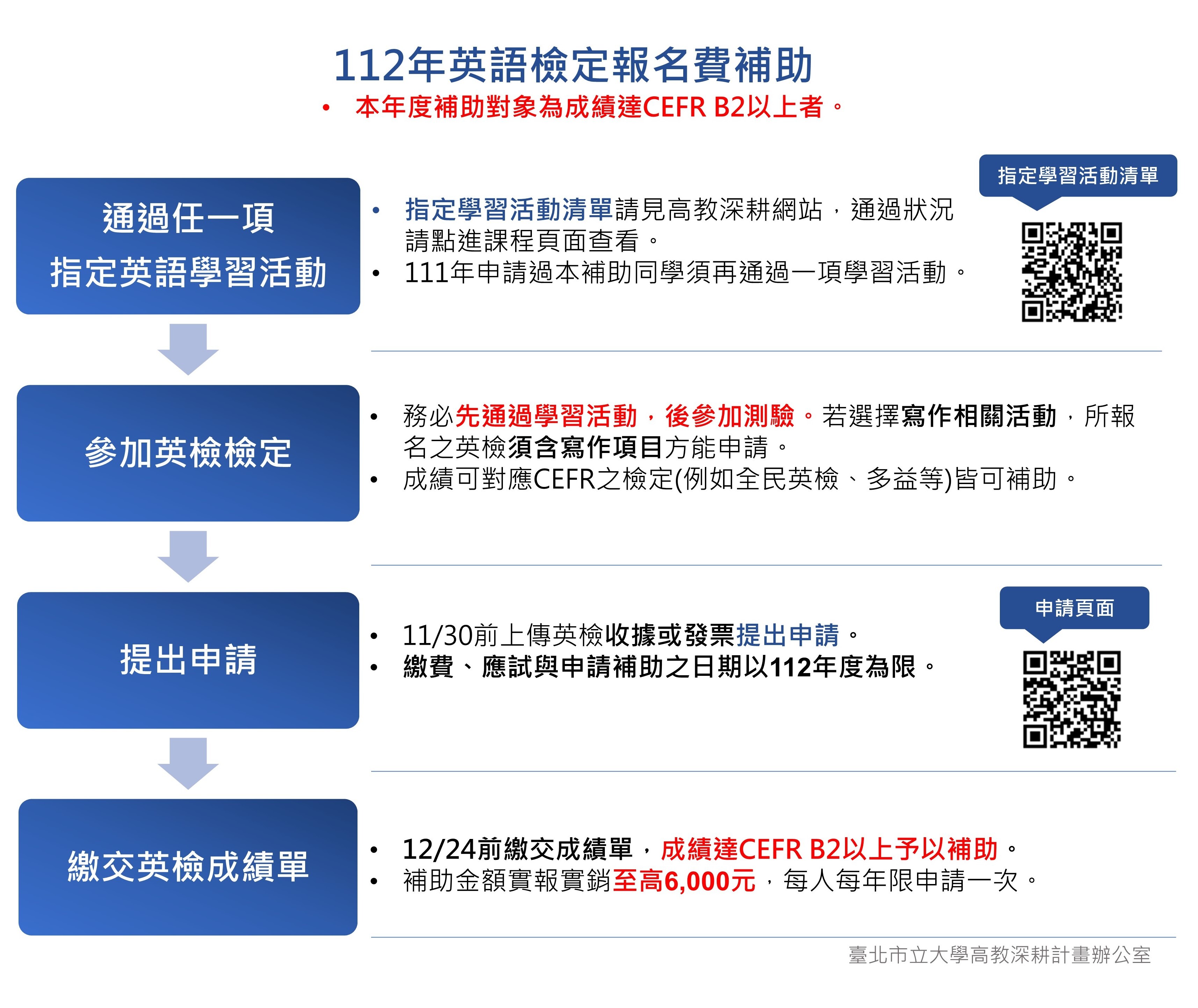 - 若該檢定項目(聽力、閱讀、口說及寫作)為分開報名者,可持該檢定不同項目報名單據於補助金額上限額度內一併申請補助。