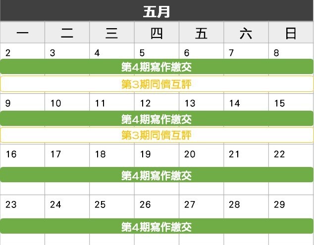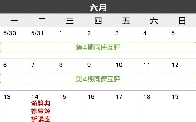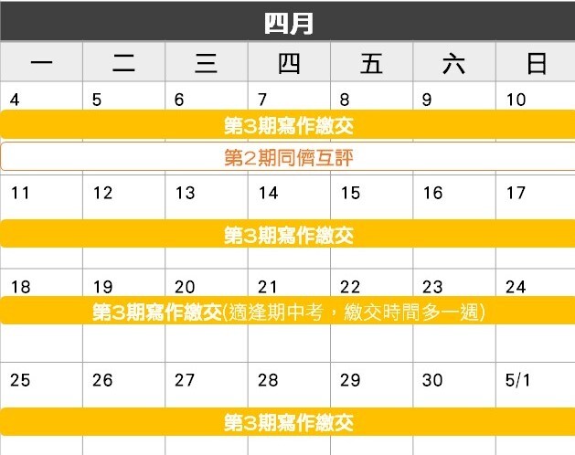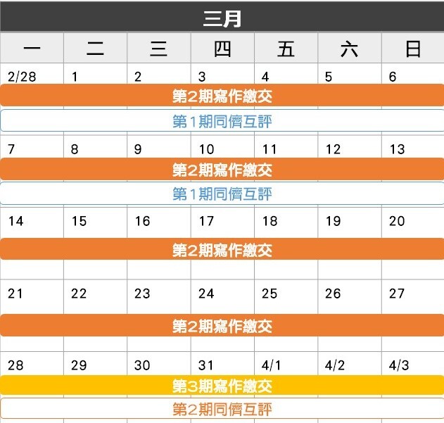 2/28(一)~3/13(日): 第1期同儕互評 (2週)
