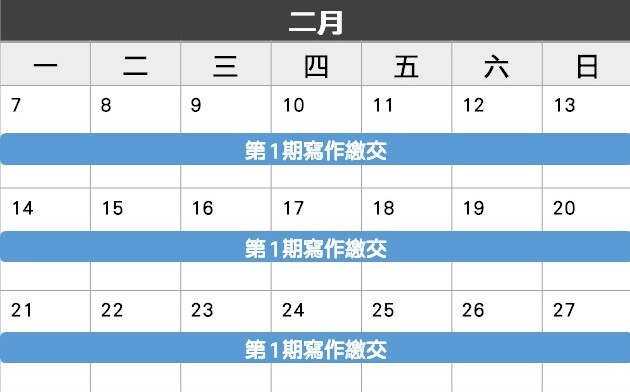 2/7(一)~ 2/27(日): 第1期作文繳交 (3週)