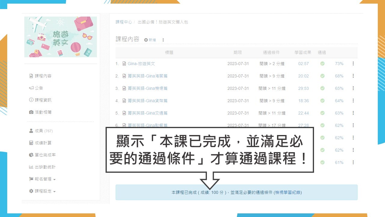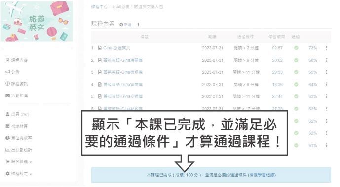 1. 需完成所有課程內容(包含觀看課程、通過線上測驗及填完問卷等),課程頁面均顯示「本課程已完成,並滿足必要的通過條件」